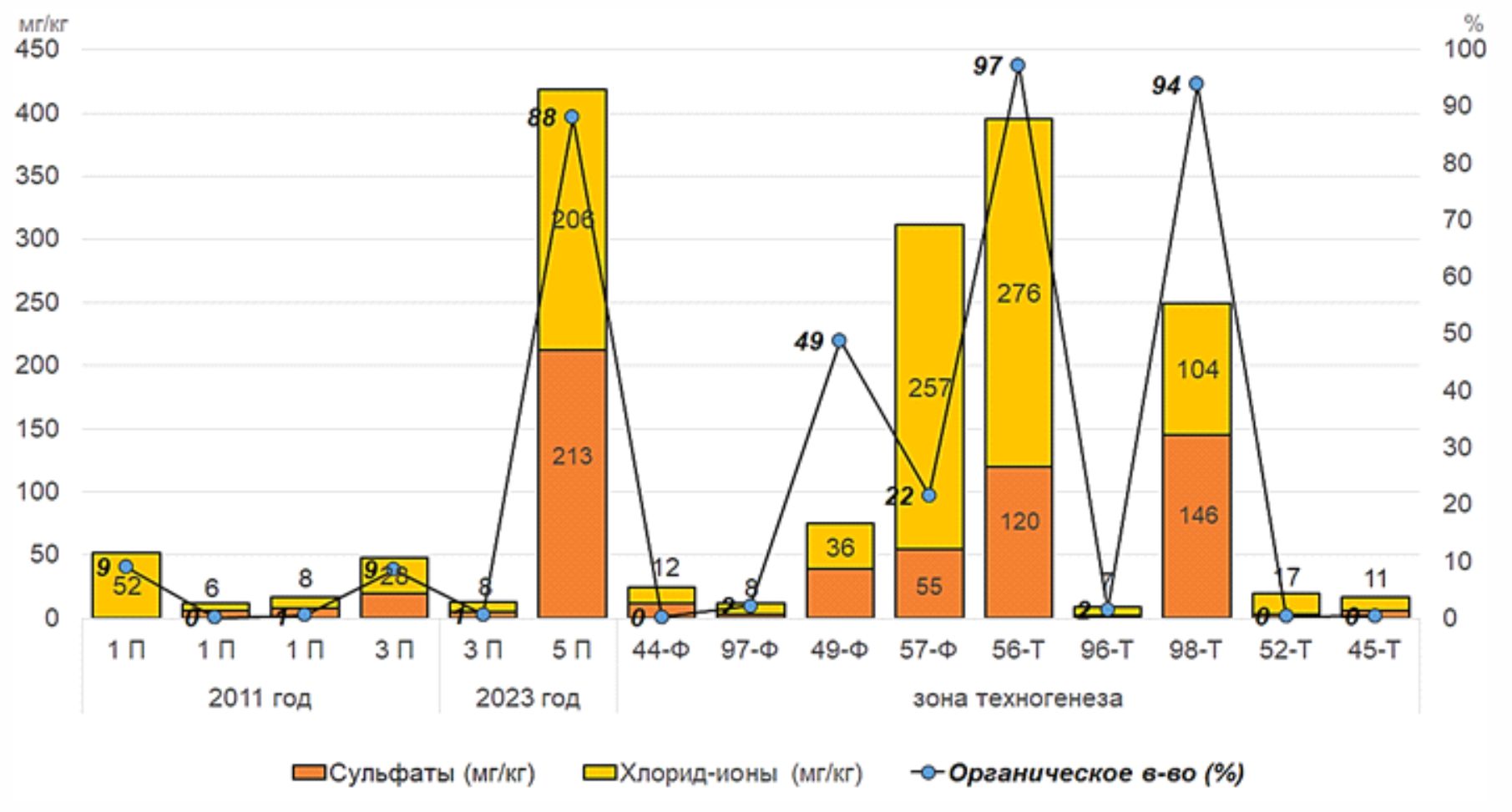 Рис. 5. Содержание ионов сульфатов, хлоридов и органического вещества в пробах почв ПП и техногенной зоны возвышенности Сибирские увалы