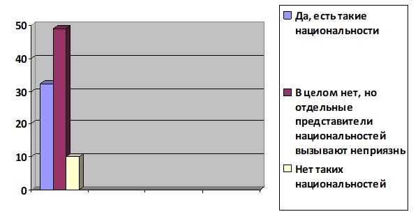 32,3% опрошенных сказали, что существуют национальности, к которым они относятся предвзято. 48,9% обучающихся указали, что в целом относятся одинаково ко всем национальностям. 10,1% обучающихся хорошо относятся ко всем национальностям (см. диаграмму 3).
