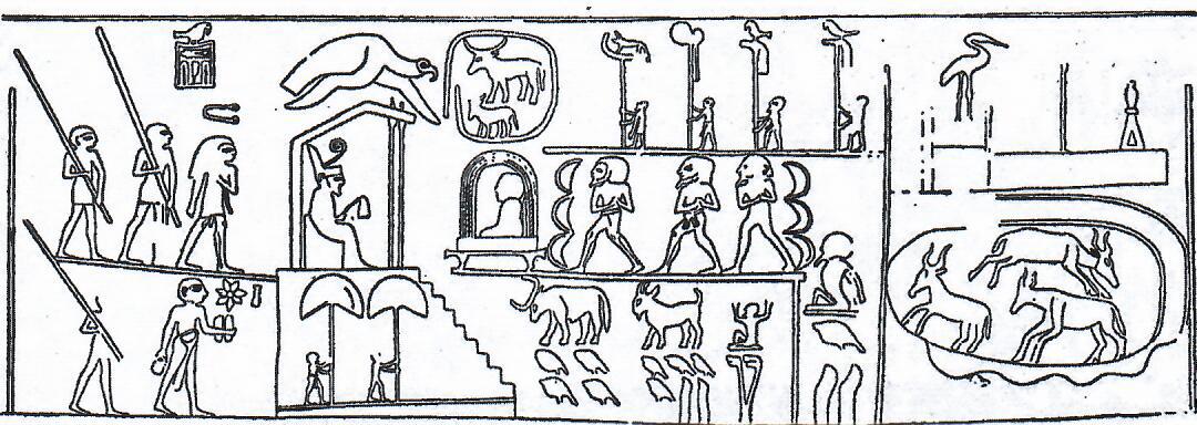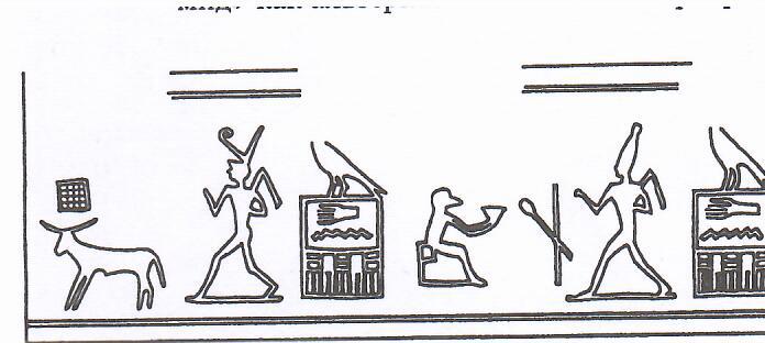 Бык почитался в раннединастическом Египте как символ высшего сакрального проявление царской власти. Наиболее ранние изобразительные тексты, причастные к этим верованиям, относятся к амратской фазе культуры Нагада, когда сложилась социальная элита с вождем во главе племенных организмов. На некоторых сосудах типа С представлены сцены триумфа социального лидера. На одном из сосудов из могилы 415 в некрополе Умм эль-Кааб (Абидос) в верхней части тулова сосуда изображен вождь, фланкированный его сторонниками. А ниже шествуют бегемоты, в египетской традиции символизирующие врагов, которых тянут на веревках охотники. Впереди этой группы бежит бык, который, как полагает С. Хендрикс, представляет собой наиболее раннее воплощение символа царской власти [27] (рис. 10).