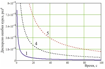 Рисунок 8 – Дисперсия ошибка оценки курса полета для конфигураций 1, 4, 5