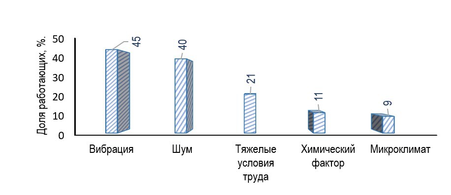 Статистические данные мониторинга условий труда свидетельствуют об аналогичной ситуации в отдельных отраслях народного хозяйства страны. Даже если зашумлённость является не самым распространенным фактором, она относится к числу основных причин, создающих вредные и опасные условия труда, которые инициируют профзаболевания, как, например, в сельском хозяйстве [Контарева и др., 2023] и на основных технологических операциях нефтедобычи [Вадулина и др., 2020], что иллюстрируется рисунками 5 и 6.