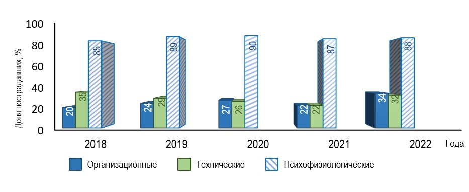 Принято причины травматизма [Результаты..., 2020] разделять на кластеры: организационные, технические и психофизиологические причины (рисунок 9). На авиапредприятиях превалируют причины, связанные с нарушением физиологических характеристик человека и его поведением.