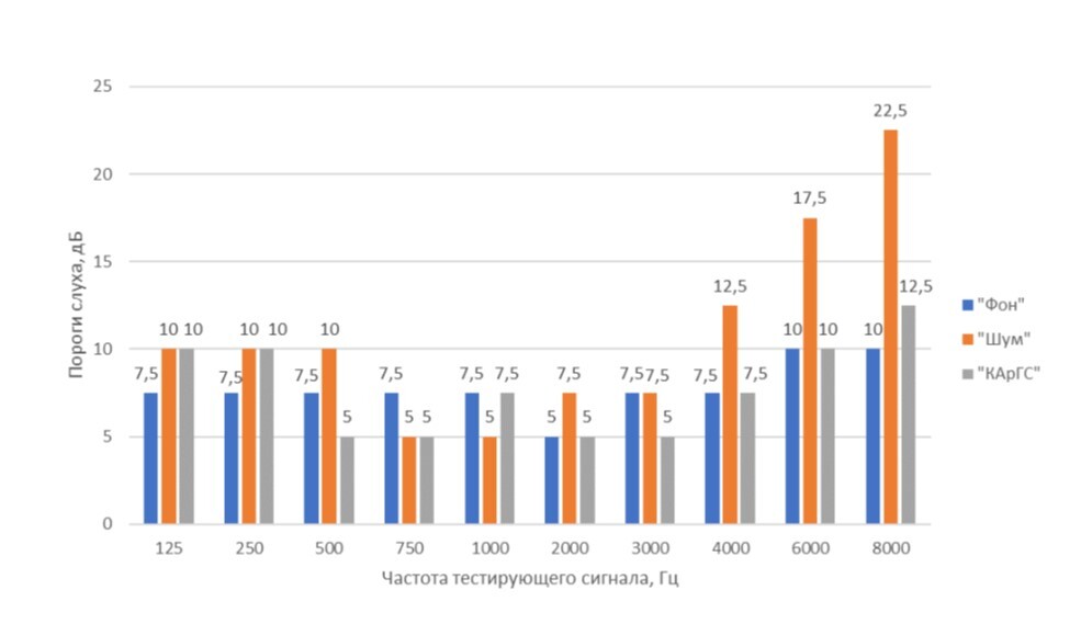 Эффективность применения аргоно-кислородной смеси (КАрГС) в виде предварительных ингаляций подтверждается тем, что в ходе экспериментальной проверки соотношения «сигнал/шум» ЗВОАЭ для всех испытуемых нормализовались и превзошли аналогичные показатели, полученные в цикле испытаний «Шум». Выявлено, что звуки октавной полосы частот со среднегеометрическим значением 4 кГц способствуют экстремальным изменениям слуха.
