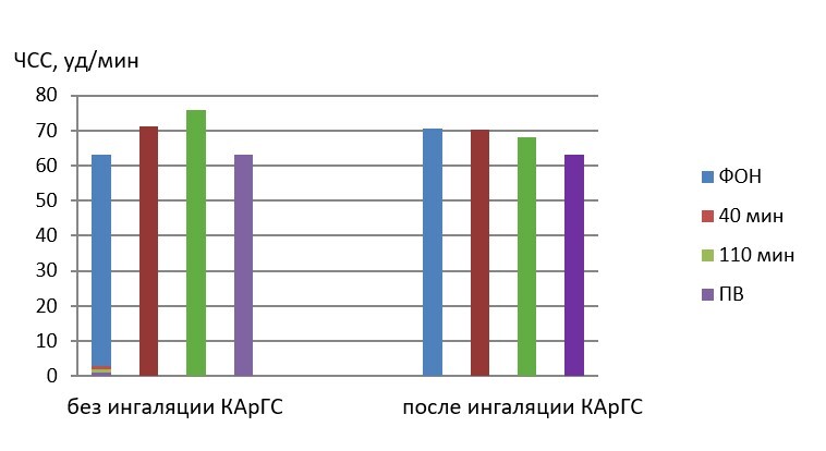Воздействие шума на человека приводит к состоянию повышенного напряжения, далее к стрессу, который способствует развитию защитно-приспособительных реакций организма с задействованием симпатоадреналовой системы. Объективными индикаторами тонуса вегетативной нервной системы (ее симпатического и парасимпатического отделов), отражающими любые напряжения, изменения в психоэмоциональном состоянии человека или развитие стресса, являются показатели вариабельности ритма сердца. Изменение числа сердечных сокращений (ЧСС) в 1 минуту при обычном воздействии шума и при отопротекции (предварительными ингаляциями КАрГС) иллюстрируется результатами экспериментов, представленными на рисунке 14.