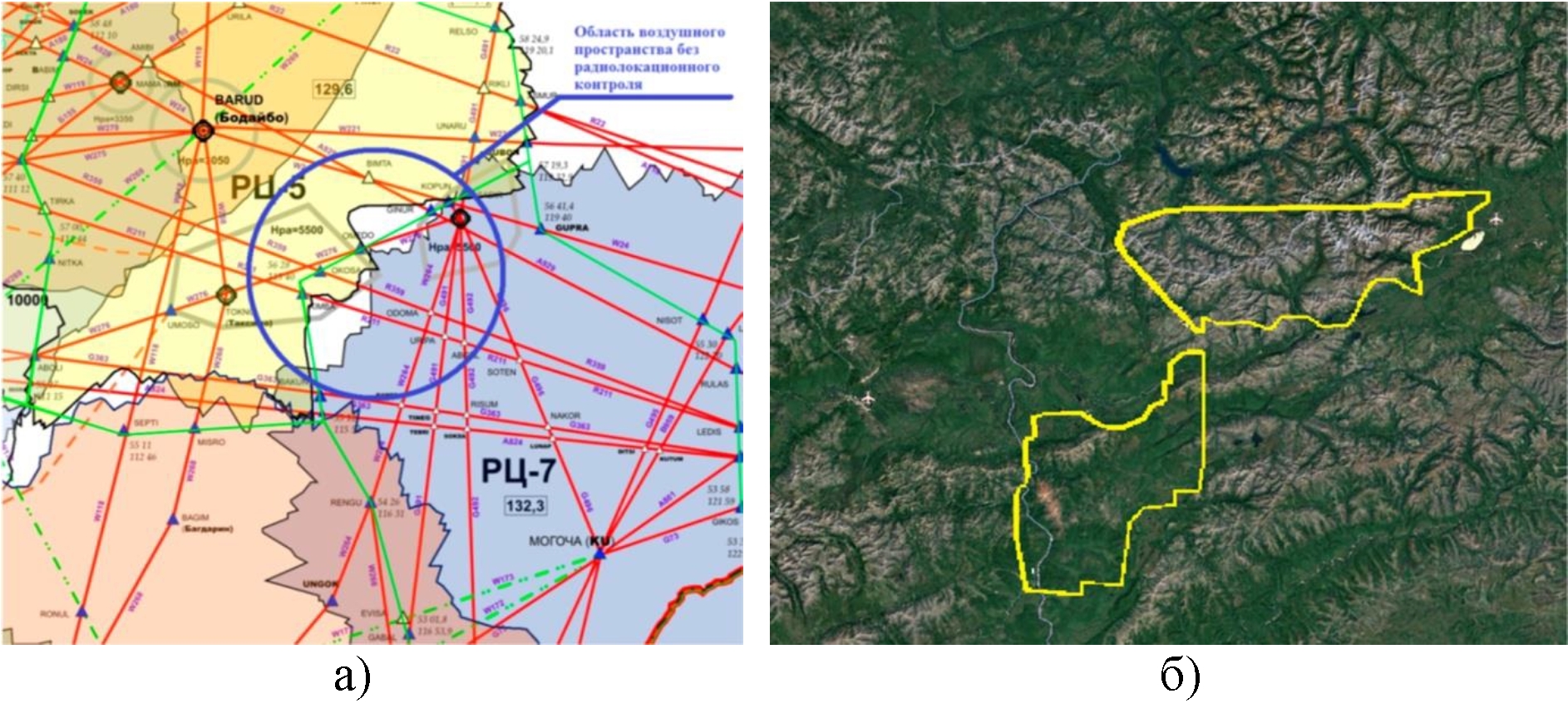 На схеме расположения средств наблюдения, в виде позиционирования радиолокаторов разного назначения2 и прохождения воздушных трасс (рис. 1), есть области воздушного пространства на границе секторов 5 и 7, где отсутствует радиолокационное наблюдение (рис. 2.а), отображенные на географической карте (рис. 2.б), это обусловлено гористым ландшафтом местности (отсутствием прямой видимости), что свойственно классическим радиолокационным системам [Определение местоположения …, 2021].