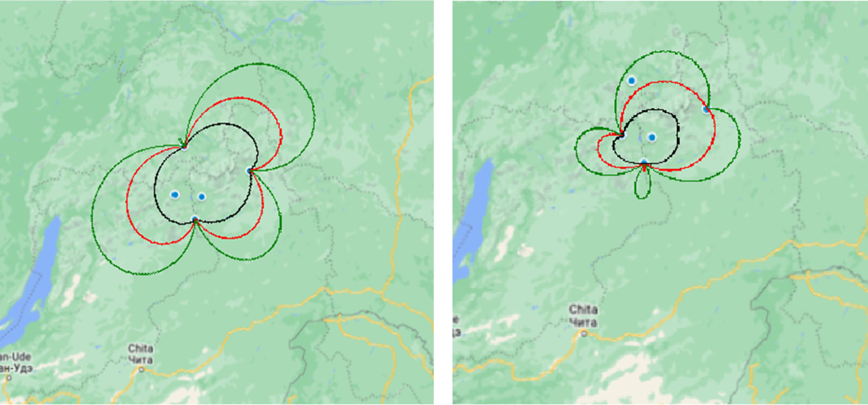 На работоспособность МПСН (точностные характеристики) существенно влияет топология размещения позиций системы, а именно геометрический фактор (места расположения НЗ) и размеры зон покрытия [Using…, 2022]. Расчет данных характеристик производился путем построения зоны видимости системы с учетом дальности установки приемников друг от друга и их количества применительно к трем областям воздушного пространства Российской Федерации, находящимся под управлением региональных центров ОрВД: Иркутским, Нерюнгринским и Магаданским.
