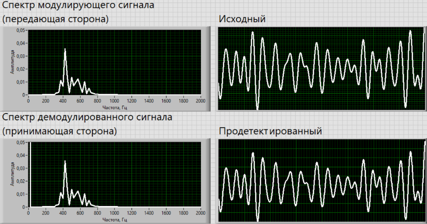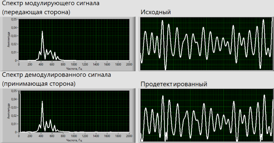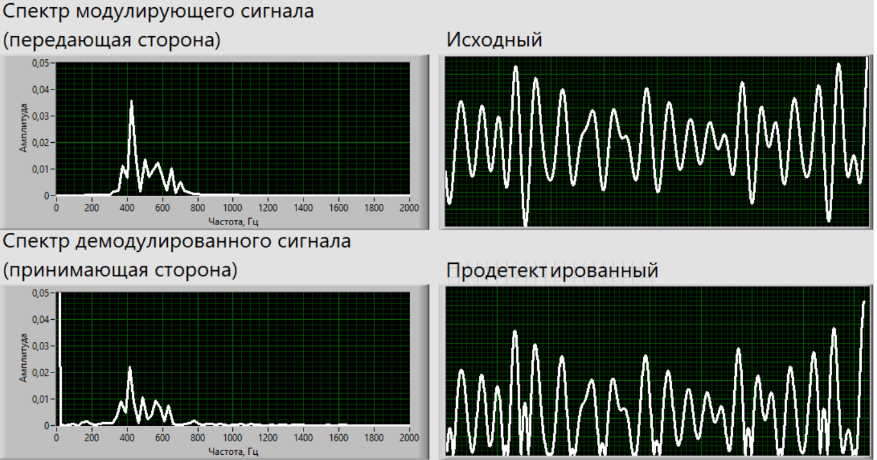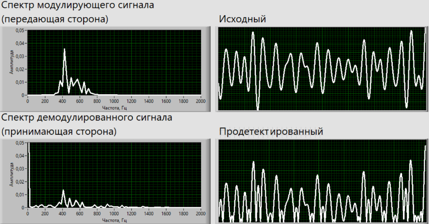 С целью определения степени влияния перемодуляции на детектируемый сигнал было проведено моделирование в программной среде LabView [Сергеев, 2020]. На рисунках 1-5 приведены искажения во временной и частотной областях, получаемые при детектировании перемодулированного сигнала с различными глубинами модуляции. Тестовый сигнал – случайно сгенерированный спектр в диапазоне 300 – 700 Гц, имитирующий речевое сообщение.