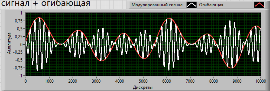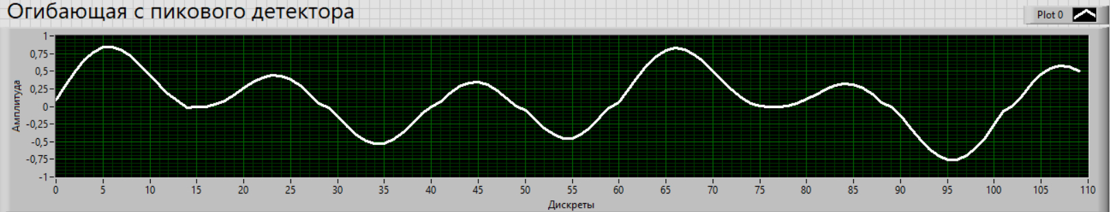 Рисунок 11 – Продетектированный перемодулированный сигнал: в сравнении с огибающей на рисунке 8 наблюдаются минимальные искажения, вызываемые дискретностью обработки сигнала