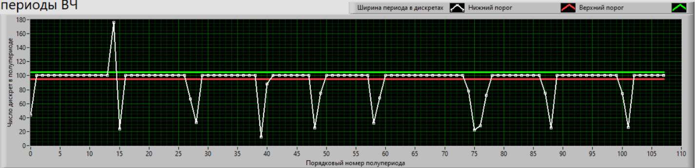 Поскольку при цифровой обработке возникают ошибки, связанные с дискретностью получаемых значений, перед анализом полученный массив точек проходит через пороговое устройство с двойным порогом, в котором устраняются малые флуктуации измеренных значений полупериодов, вызванных дискретностью счёта. Значения, принадлежащие диапазону 0,05 от моды полупериода (считается, что так как несущая частота много больше самой высокой частоты информационного сигнала, то мода от полученного значения полупериодов будет численно равна истинному полупериоду несущего колебания), приравниваются к полученному значению моды. Полученный массив для данного сигнала приведён на рисунке 10.