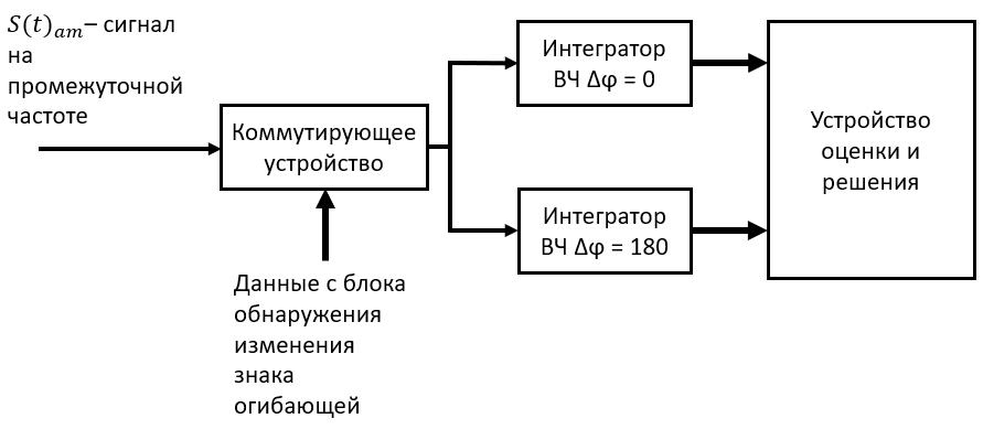Блок обнаружения перемодуляции представляет собой коммутирующее устройство, два интегратора и устройство оценки и решения. Структурная схема данного блока приведена на рисунке 12.