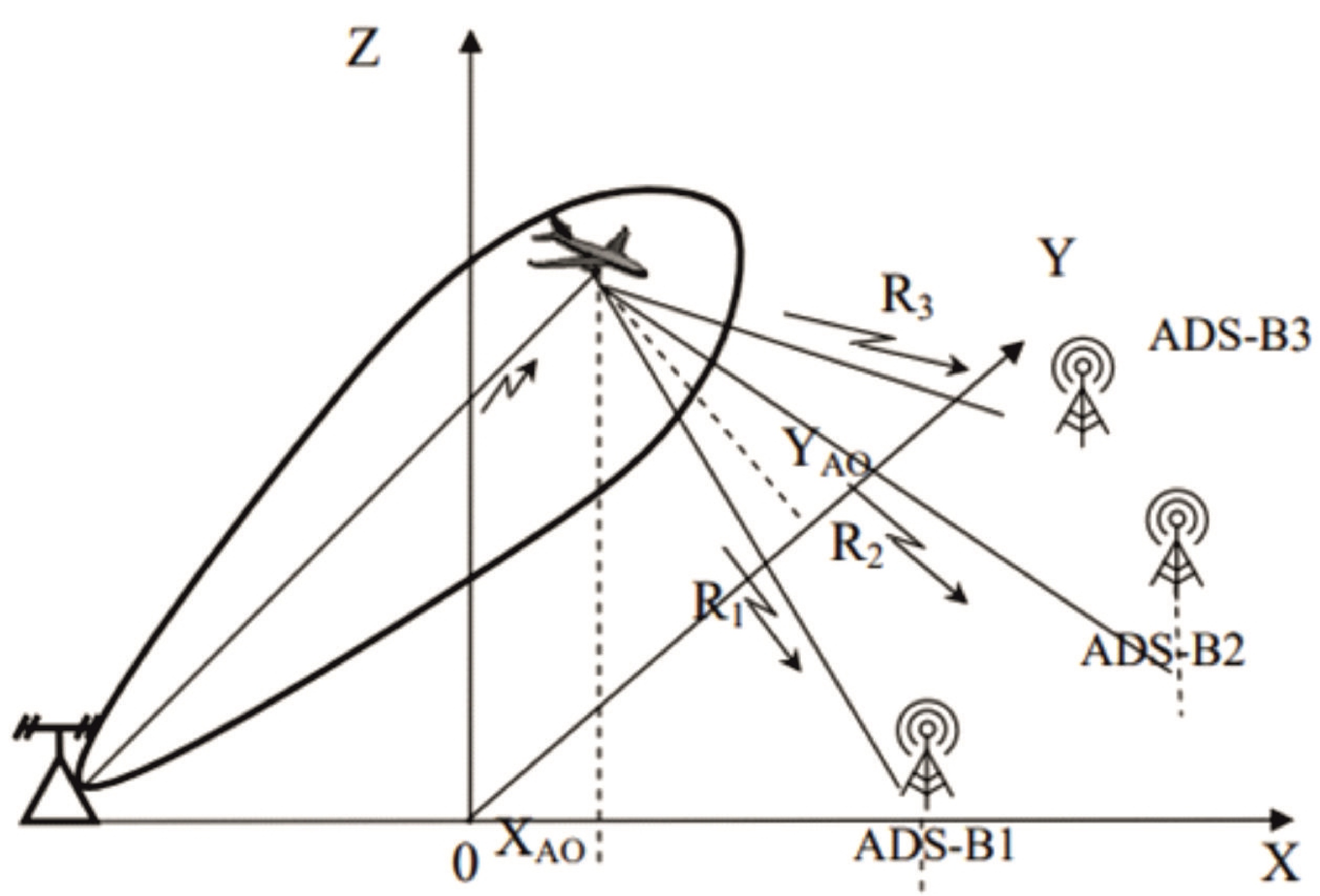 Рассмотрим использование многопозиционной системы приемников при реализации технологии мультилатерации для определения координат ВС, как показано на рис. 1 [Development a method for determining…, 2021].