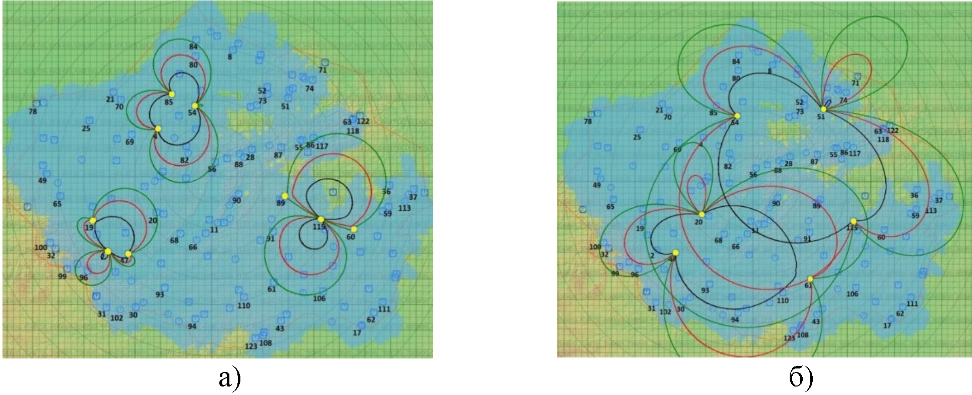 Рисунок 7 – Построение рабочей зоны МПСН Иркутского РЦ ОрВД для конфигураций наземных станций с номерами: а) 2-19-47, 4-54-85, 60-89-119; б) 20-47-61, 51-54-115