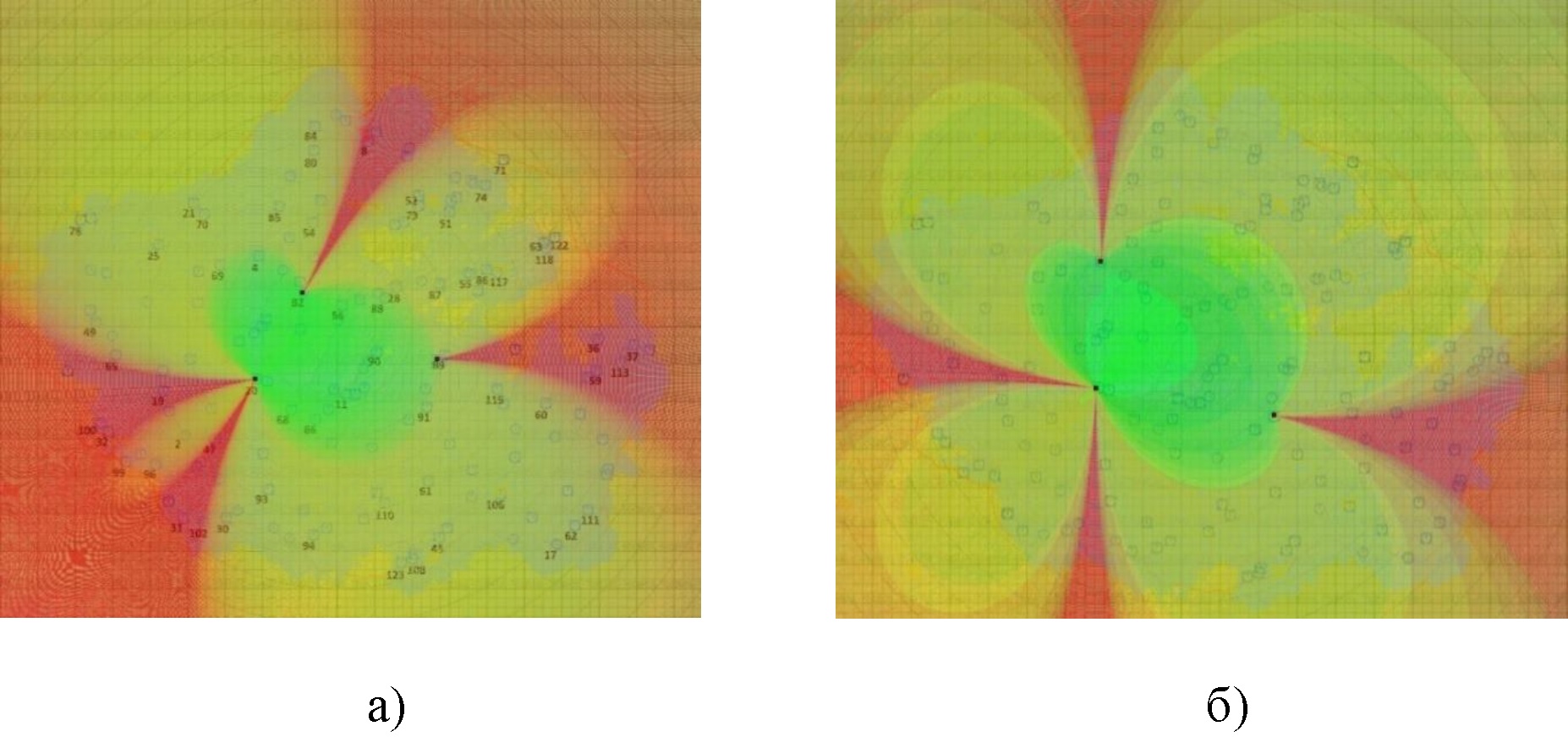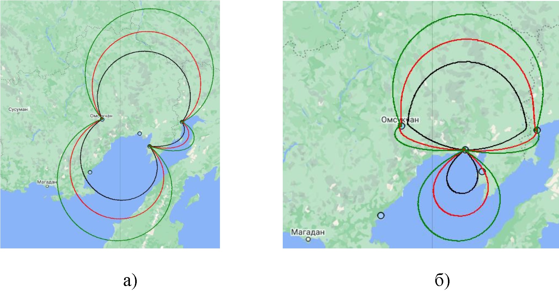 Для выбранного размещения НЗ были построены рабочие зоны, при начальных условиях требуемой точности: среднеквадратическое отклонение (СКО) измерения временного интервала 10-9 с; СКО радиальной ошибки: 5, 10, 20 метров (чёрный, красный, зелёный линии соответственно) (рис. 7, а, б). Построенная зона для двух пар НЗ позволяет обеспечить качественный прием сигнала от ВС при использовании двух пар станций с заданным качеством ошибок позиционирования.