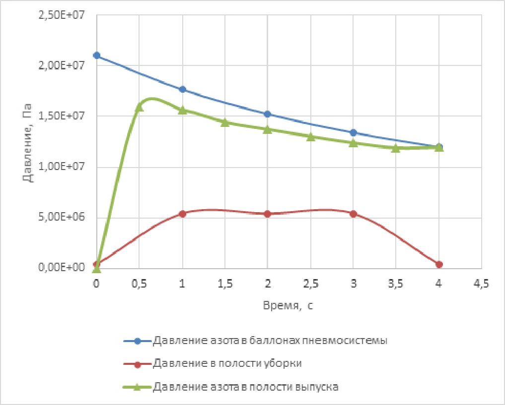 Анализ результатов моделирования позволяет сделать вывод о том, что усилие гидроцилиндра плавно нарастает в начале страгивания опоры, развивая при этом усилие на штоке гидроцилиндра на 20 – 25% больше по сравнению с выпуском от гидравлической системы и 40 – 45% выше по сравнению с аварийным выпуском от пневмосистемы. Заметим, что давление газа в газогенераторе и в полости выпуска гидроцилиндра ООШ не превышает рабочее давление в гидросистеме, поэтому нагрузки на стенки гидроцилиндра по сравнению с выпуском от гидросистемы не изменяются, усиление корпуса и штока гидроцилиндра не требуется.