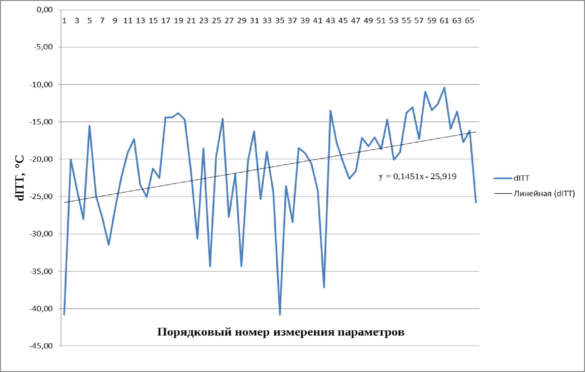 На рисунке 4 приведен график изменения отклонения параметра ΔITT в соответствии с порядковым номером измерения. На графике построена аппроксимирующая прямая, характеризующая тенденцию изменения параметров ΔITT температуры газа между турбинами в ходе летной эксплуатации двигателя. Коэффициент, характеризующий наклон прямой к оси абсцисс, равен 0,145. Измеренный параметр имеет тенденцию к снижению.