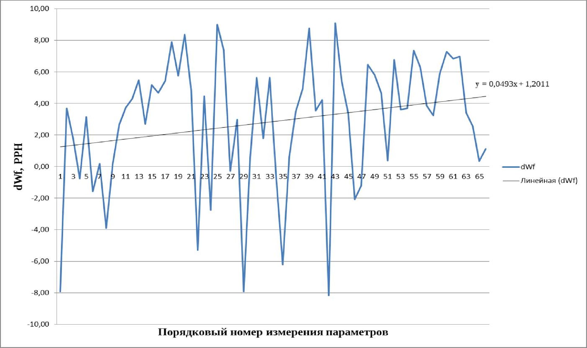 На рисунке 6 приведен график изменения отклонения параметра ΔWf в соответствии с порядковым номером измерения. Коэффициент, характеризующий наклон аппроксимирующей прямой мгновенного расхода топлива к оси абсцисс, имеет значение 0,0493. Измеренный параметр имеет тенденцию к снижению.