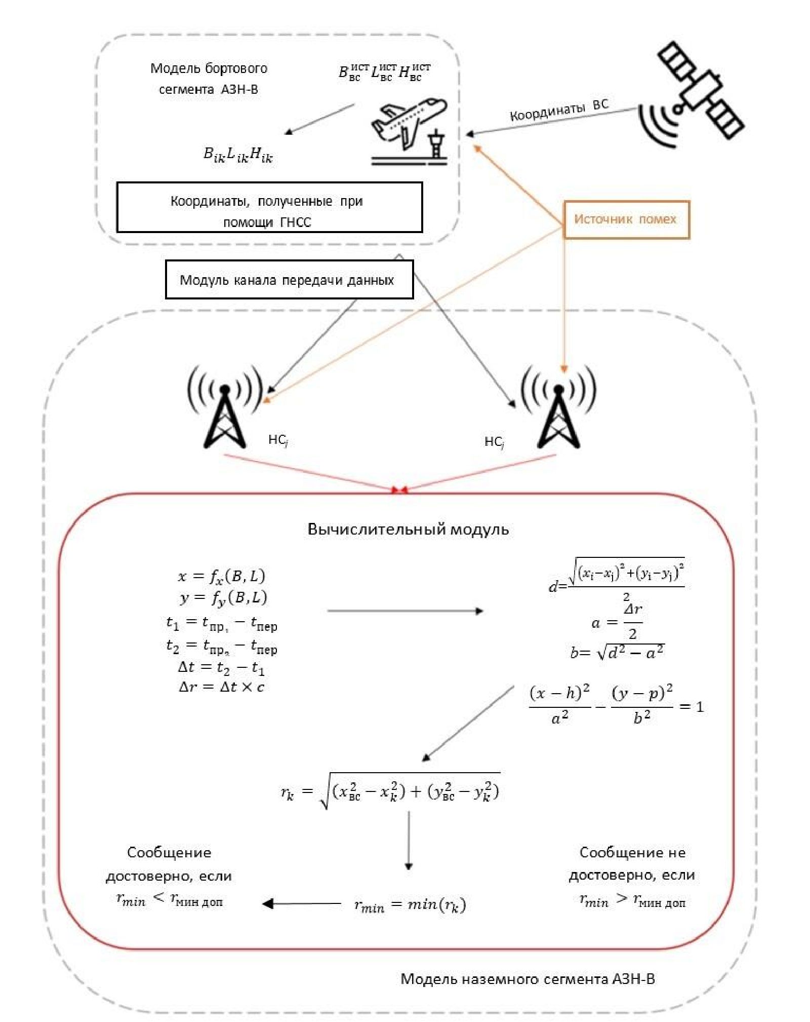 Рассмотрим представленную на рисунке 1 модель подтверждения достоверности сообщения АЗН-В на поверхности аэродрома, где отображены основные компоненты, а также в математической форме описаны процессы, происходящие в каждой ее составной части.