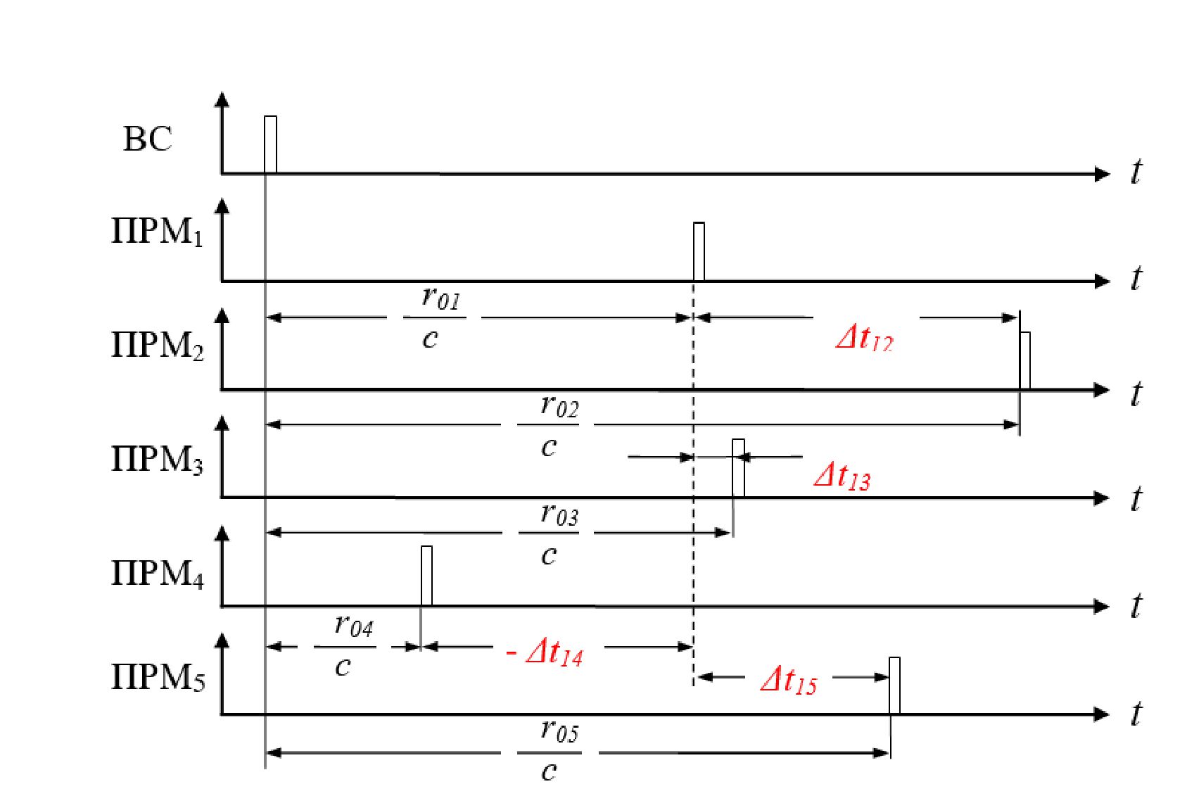 Рисунок 8 – Временная диаграмма работы многопозиционного метода определения координат, Источник: https://studylib.ru/doc/6578747/teoreticheskie-osnovy-radionavigacii-i-radiolokacii