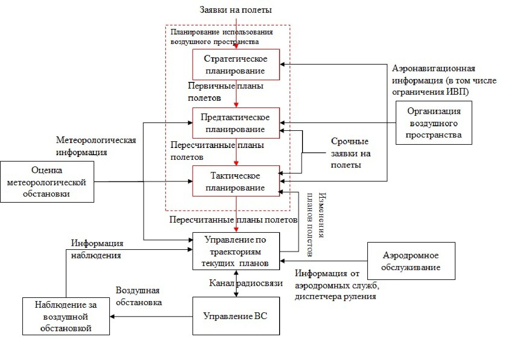 Планирование использования воздушного пространства заключается в организации потоков воздушного движения с соблюдением заданных требований к безопасности, пропускной способности и экономичности воздушного движения. Планирование использования воздушного пространства делится на три этапа: стратегическое (за двое и более суток), предтактическое (накануне) и тактическое (изменение плановой траектории в процессе полета) [Федеральные …, 2011]. Результатом стратегического планирования является предварительное расписание полетов ВС на длительный период. В процессе предтактического планирования корректируются плановые траектории ВС таким образом, чтобы соблюсти поступившие ограничения и заявки на полеты. В процессе тактического планирования траектории ВС корректируются с учетом планов, поступивших в течение последних 24 часов [Федеральные …, 2011].