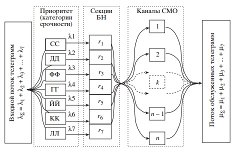 Рисунок 4. Система обслуживания с относительными приоритетами и приемом заявок на полеты ВС в раздельные секции буферного накопителя [Ребров и др., 2007, с. 100]