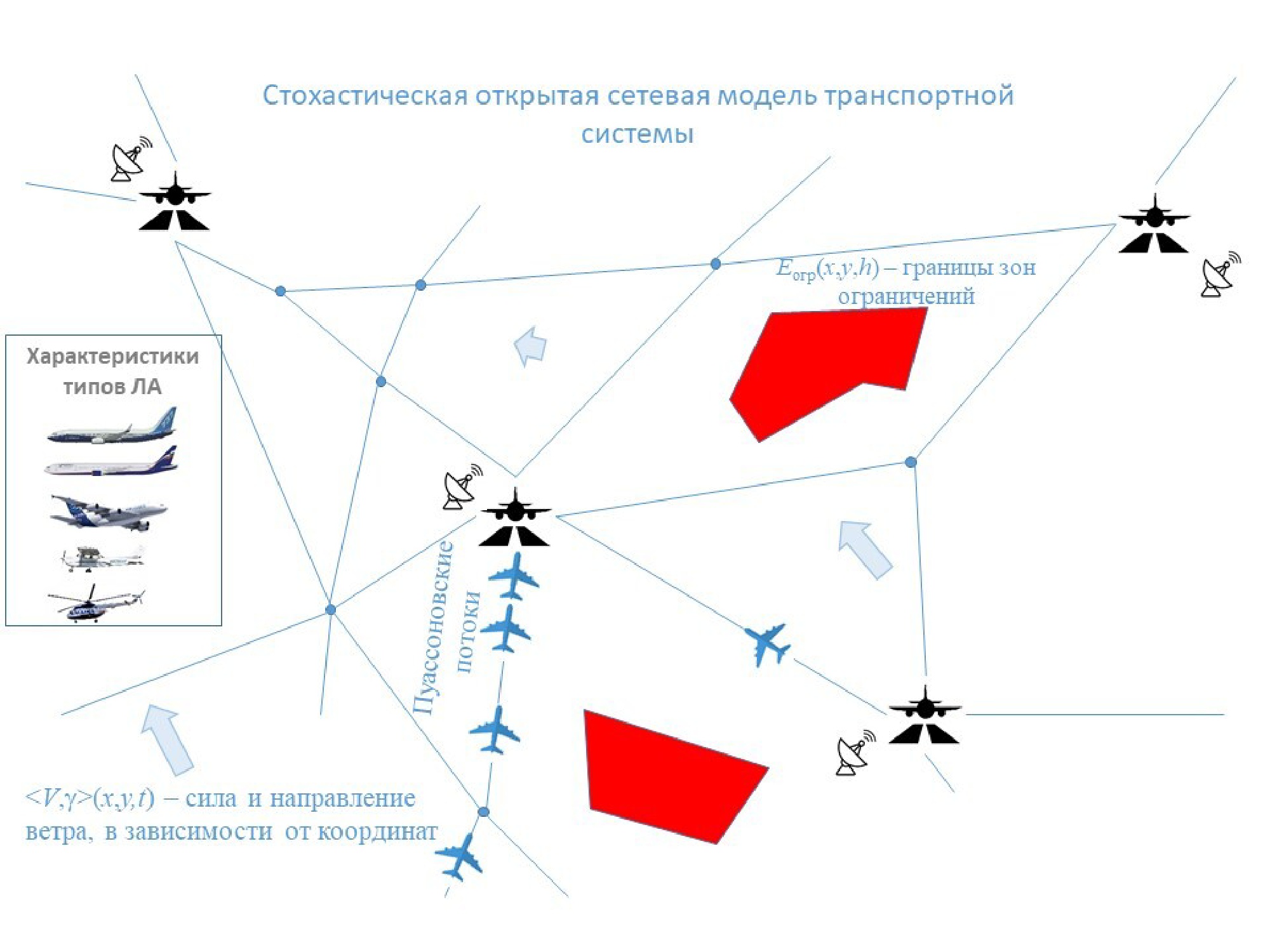 Из выделенных моделей синтезирована стохастическая открытая сетевая модель транспортной системы, представленная ориентированным графом GВП (VКТ, Eм), вершинами которого VКТ = (xКТ, yKT) являются аэродромы и контрольные точки, являющиеся пересечениями маршрутов. Ребрам графа Eм = (VКТi, VКТj) сопоставлено множество допустимых коридоров движения ВО, определяемых в виде d ((xВО – x0), (yВО – y0), (hВО – h0)) ≤ dmax, где (x0, y0, h0) – ближайшая точка на участке маршрута, проходящего между вершинами VКТi и VКТj; dmin (c1,c2) – минимально допустимый показатель безопасности, вычисляемый по наименьшим нормам эшелонирования min(<mг1, mв1>(x1, y1, h1), <mг2, mв2>(x2, y2, h2)), зависящим от координат точек и отличающимся в различных областях пространства, где ci = (xi, yi, hi, ti) – 4D-точка.