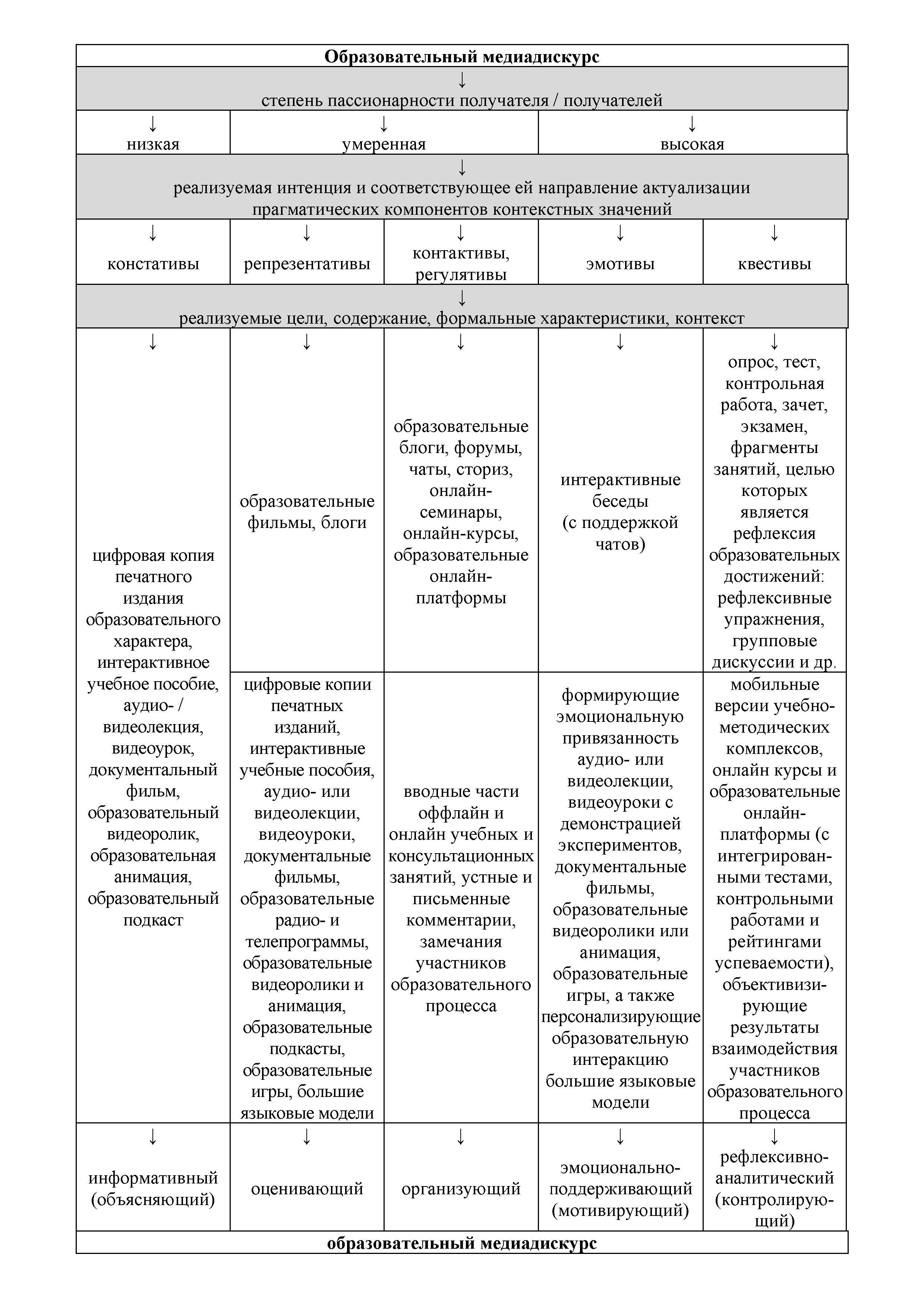 Введение лингвопрагматического параметра создаёт основу для осуществления классификации подтипов образовательного медиадискурса с учетом доминирующих направлений актуализируемых отправителем прагматических компонентов значений и степени пассионарности участников вербальной интеракции.