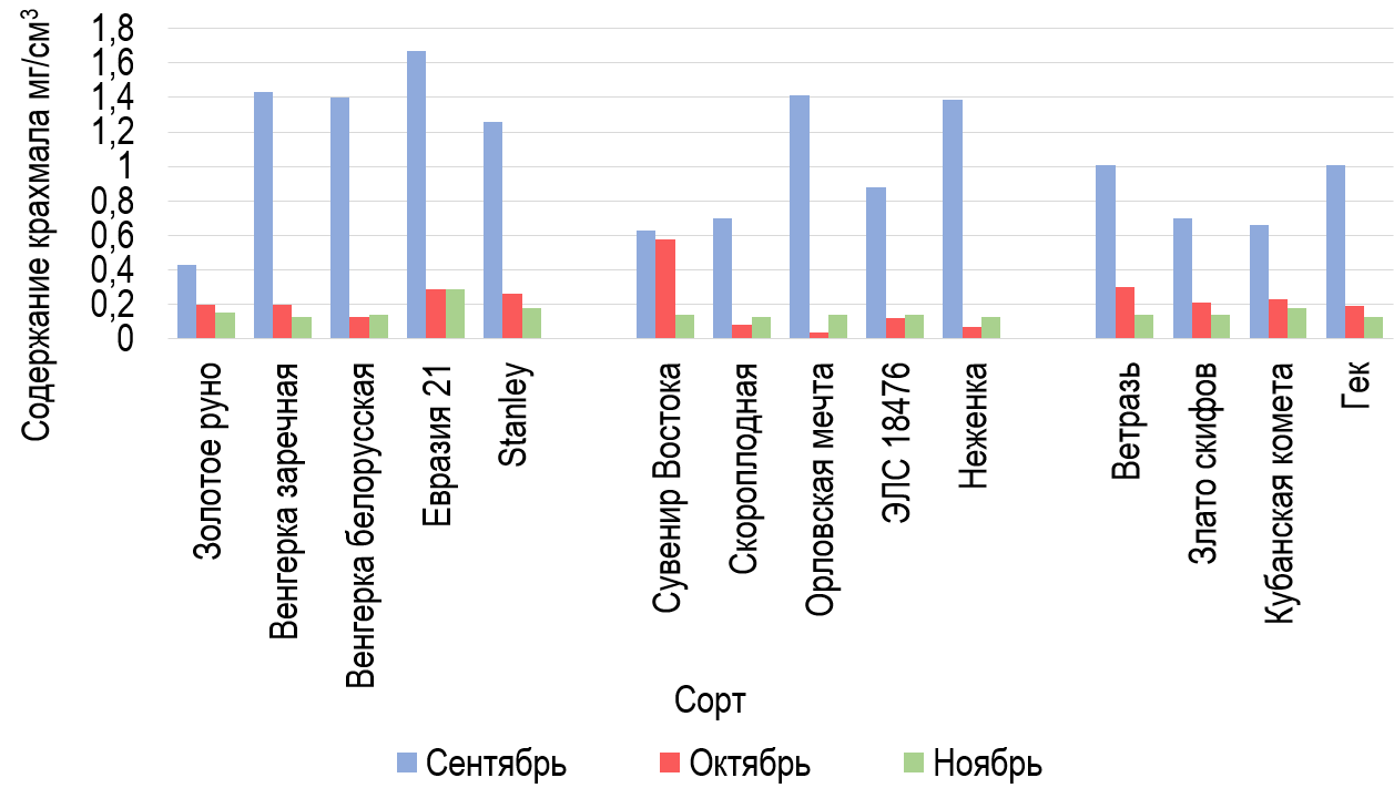 В сентябре у представителей Prunus salicina в коре однолетних побегов содержание крахмала содержалось в среднем – 0,91 мг/см3 и активность амилазы составила – 166,33 мг крахмала·ч/г (рисунок 3). В октябре в процессе гидролиза отмечено снижение количества крахмала у изучаемых сортов сливы в 4,3 раза по сравнению с сентябрем на фоне снижения в 4,08 раза активности фермента амилаза в коре однолетних побегов. В ноябре гидролиз крахмала шел интенсивнее у сортов Prunus salicina за счет в среднем более высокой активности амилазы (166,31 мг крахмала·ч/г) по сравнению с представителями Prunus domestica (134,86 мг крахмала·ч/г) и Prunus × rossica Erem. (145,21 мг крахмала·ч/г). Тенденция понижения уровня крахмала и роста активности амилазы в коре однолетних побегов сливы сохранилась и в ноябре. В этом месяце отметили снижение в 7,3 раза количества крахмала (рисунок 4) в коре однолетних побегов сортов Prunus domestica, в 7,4 раза у сортов Prunus salicina и в 5,9 раза у сортов Prunus × rossica Erem. по сравнению с сентябрем.