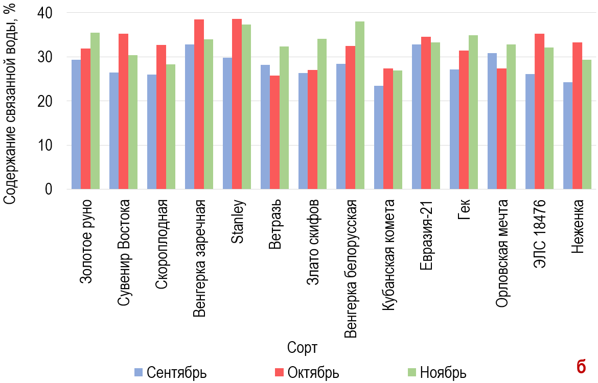 В результате проведенных исследований установлено, что содержание связанной воды в однолетних побегах сливы к началу осени у сортов Prunus domestica было выше в 1,15 и 1,17 раз, чем у сортов Prunus salicina и Prunus × rossica Erem. соответственно (рисунок 2а).