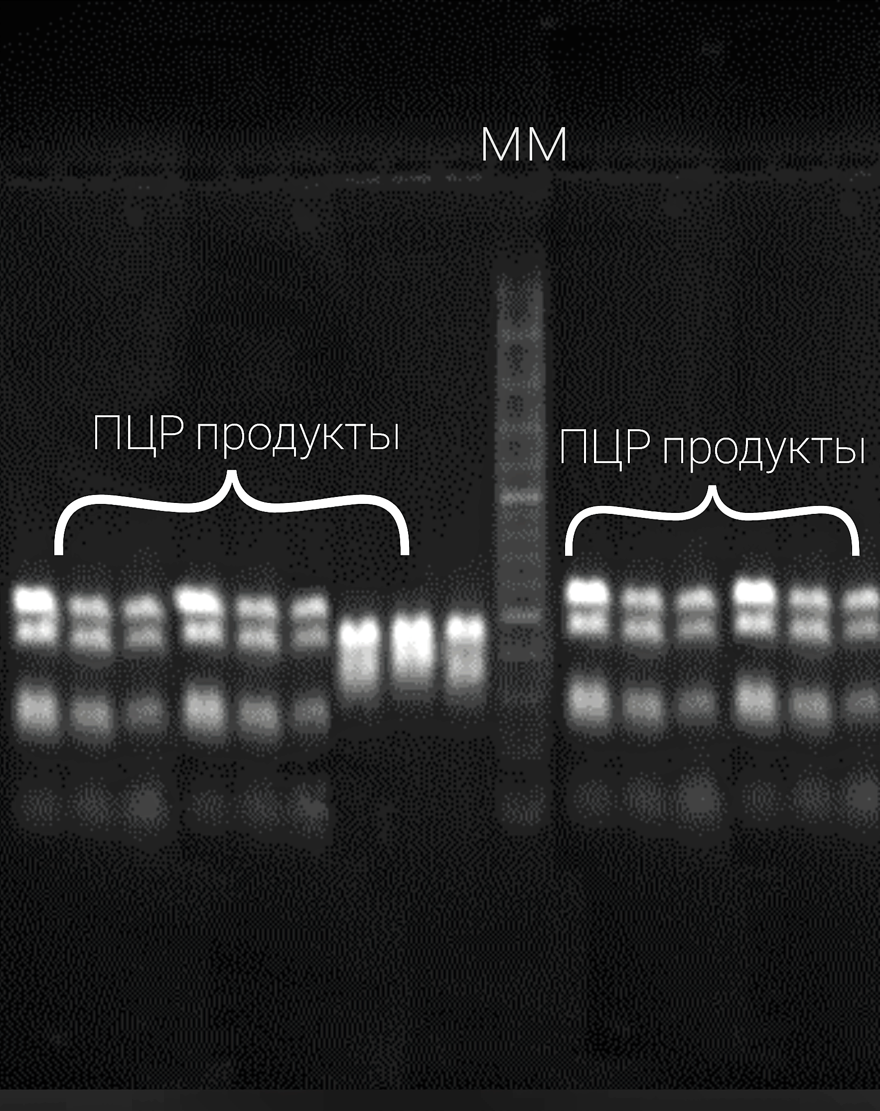 Детекция ПЦР продуктов проводилась при помощи электрофореза в 2% агарозном геле в режиме постоянного напряжения 100 V.
