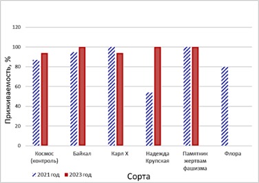 Из данного рисунка видно, что приживаемость зимних прививок в годы исследований составила более 80% у сортов Памятник жертвам фашизма, Космос, Байкал, Карл X. Наименьшая приживаемость зимних прививок была отмечена в 2020…2021 году у сорта Надежда Крупская и составила 54%.