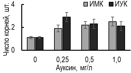 На средах с ИУК частота ризогенеза была ниже, максимальное значение 51,2 % достигнуто при концентрации ИУК в среде укоренения 0,5 мг/л. При этом если число корней на укорененный микрочеренок возрастало с ростом концентрации ИМК в среде, то на всех средах с ИУК оно было практически одинаковым и достаточно высоким (рисунок 2).