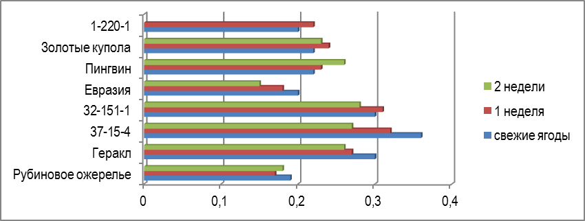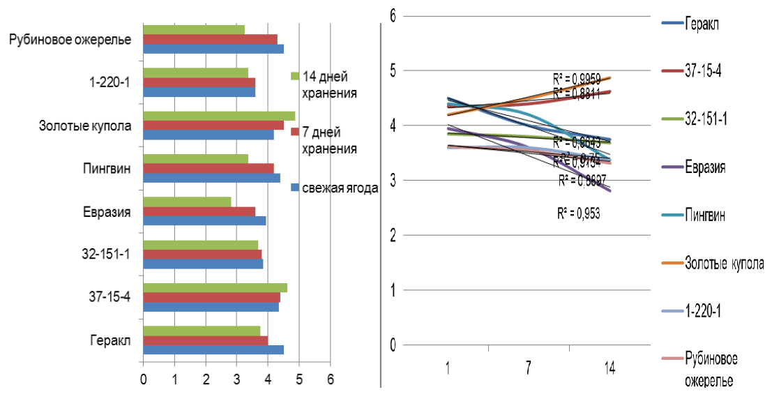 Дегустационная оценка показала, что при хранении ухудшается вкус и товарный вид у ягод сортов Рубиновое ожерелье, Евразия и Пингвин в среднем на 1,17 баллов (с 4,5 до 3,3; с 3,9 до 2,8 и с 4,4 до 3,4 соответственно). Существенно на 0,8 балла снижается оценка плодов у сорта Геракл. У формы 37-15-4 и сорта Золотые купола, наоборот, за период хранения ягоды становятся более ароматными и вкусными, поэтому средний балл повысился на 0,3 и 0,7 балла. На корреляционном графике видна прямая зависимость периода хранения от оценки плодов. Коэффициент корреляции по сортам составляет от 0,78 до 0,99. Стандартное отклонение в пределах 0,32 до 0,89.