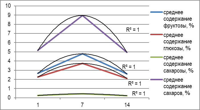 Пищевая и диетическая привлекательность плодов заключается в том, что в их составе преобладают моносахариды – глюкоза и фруктоза, в меньшем количестве дисахарид – сахароза (Матназарова, 2019). Сахара в плодах и овощах это важные запасные питательные вещества, содержание которых при хранении может увеличиваться, так как вследствие гидролиза крахмала образуется глюкоза. Особенно активно тратится сахароза (Гусейнова и др., 2007), в меньшей степени фруктоза и глюкоза. На графике содержания сахаров в плодах мы видим, что на седьмой день хранения общее содержание сахаров резко увеличивается, особенно за счет фруктозы (на 80%) и сахарозы (на 72%) и в меньшей степени происходит увеличение глюкозы (на 66%) (рисунок 2).