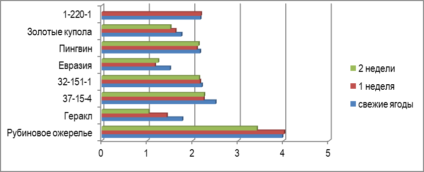 После сбора плодов была проведена первая органолептическая оценка плодов, затем ее выполнили через 7 и 14 дней. Среднестатистическое отклонение составило от 0,35 до 0,49. Результаты оценки представлены на рисунке 1.