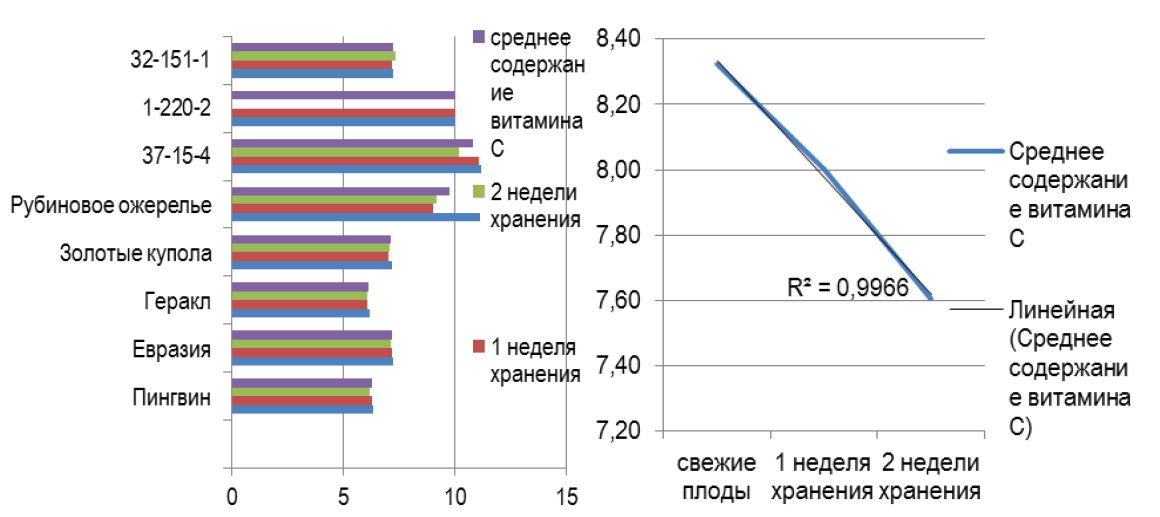 Наибольшие потери витамина С в плодах отмечены у сорта Рубиновое ожерелье и составили более 17,6% (с 11,14 мг/100г до 9,18 мг/100г) и формы 37-15-4 – более 8% (с 11,08 мг/100г до 10,18 мг/100г). У остальных сортов и форм потери витамина С составили не более 2%.