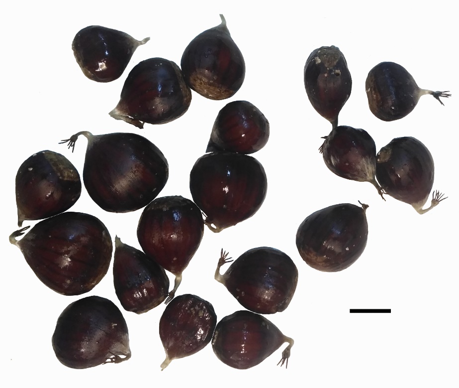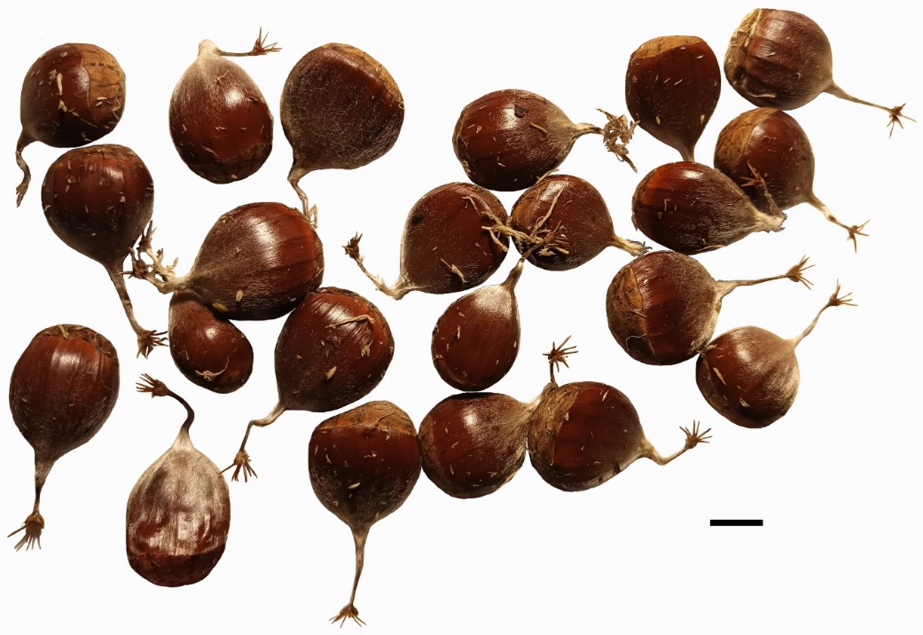 Плоды, собранные в Ботаническом саду г. Дрезден (Германия), луковицеобразной или широкояйцевидной формы, часто не уплощенные с боковых сторон, тёмно-коричневые с бордовым отливом и более тёмными продольными полосками, иногда слегка выпуклыми, глянцевые и гладкие. Ближе к верхушке слегка опушены светлыми волосками. Носик меньшей длины, чем плод, на верхушке с остатками стилодиев, прямой или согнутый, иногда частично сломан в средней части или почти под основание. Рубец серовато-коричневый, с бугорчатой поверхностью (рисунок 2).
