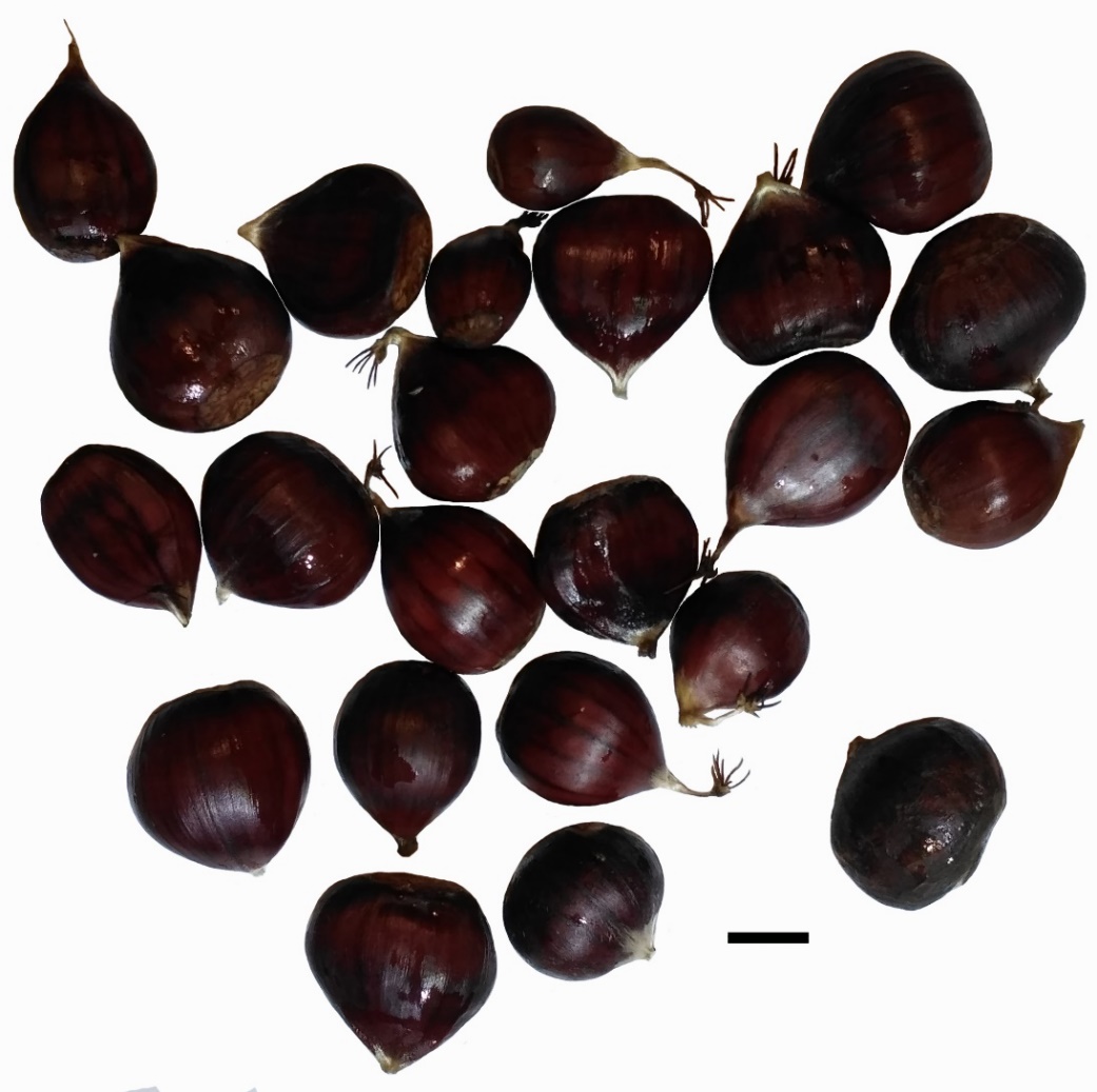 Плоды C. dentata (Экспозиция природной флоры ГБС РАН) и C. sativa соответствуют по размерам плодов по данным литературы (Соколов, 1951; Nixon, 1997). Плоды C. “dentata” (cf. C. dentata × C. sativa) (Ботанический сад г. Дрезден, Германия) сравнимы с минимальными размерами плодов C. sativa, указанными в источниках литературы, и меньше указанных размеров плодов C. dentata.