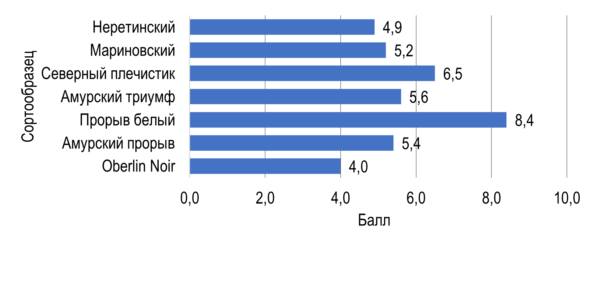 Для определения вкусовых качеств собранной ягоды проведена дегустационная оценка сотрудниками кафедры ЗРиП (рисунок 1) Вавиловского университета. Результаты показали, что по 10 балльной шкале максимальное значение имеет сортообразец Прорыв белый 8,4 балла. Минимальную оценку получил сортообразец Oberlin Noir 4,0 балла, у него отмечен посредственный вкус с высокой кислотностью.