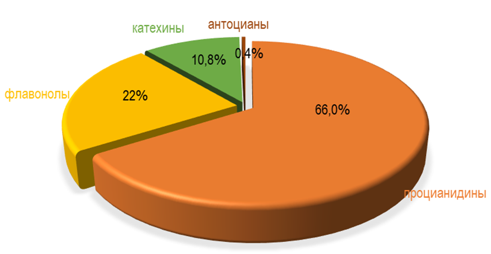 Анализ фракционного состава комплекса биофлавоноидов ягод культуры позволил установить преобладание в нем процианидинов (66,0%), значительная доля приходится на флавонолы (22,8%), лишь 10,8% – на катехины. В наименьшей степени представлены антоцианы (0,4%) (рисунок 2).
