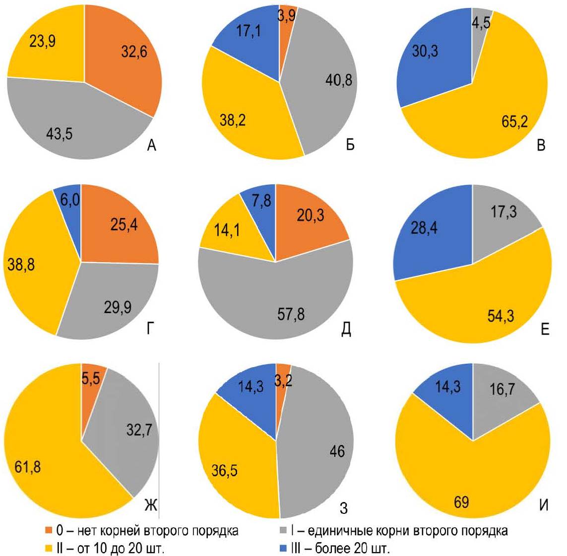 Рисунок 2 – Диаграммы распределения долей черенков в зависимости от числа корней второго порядка