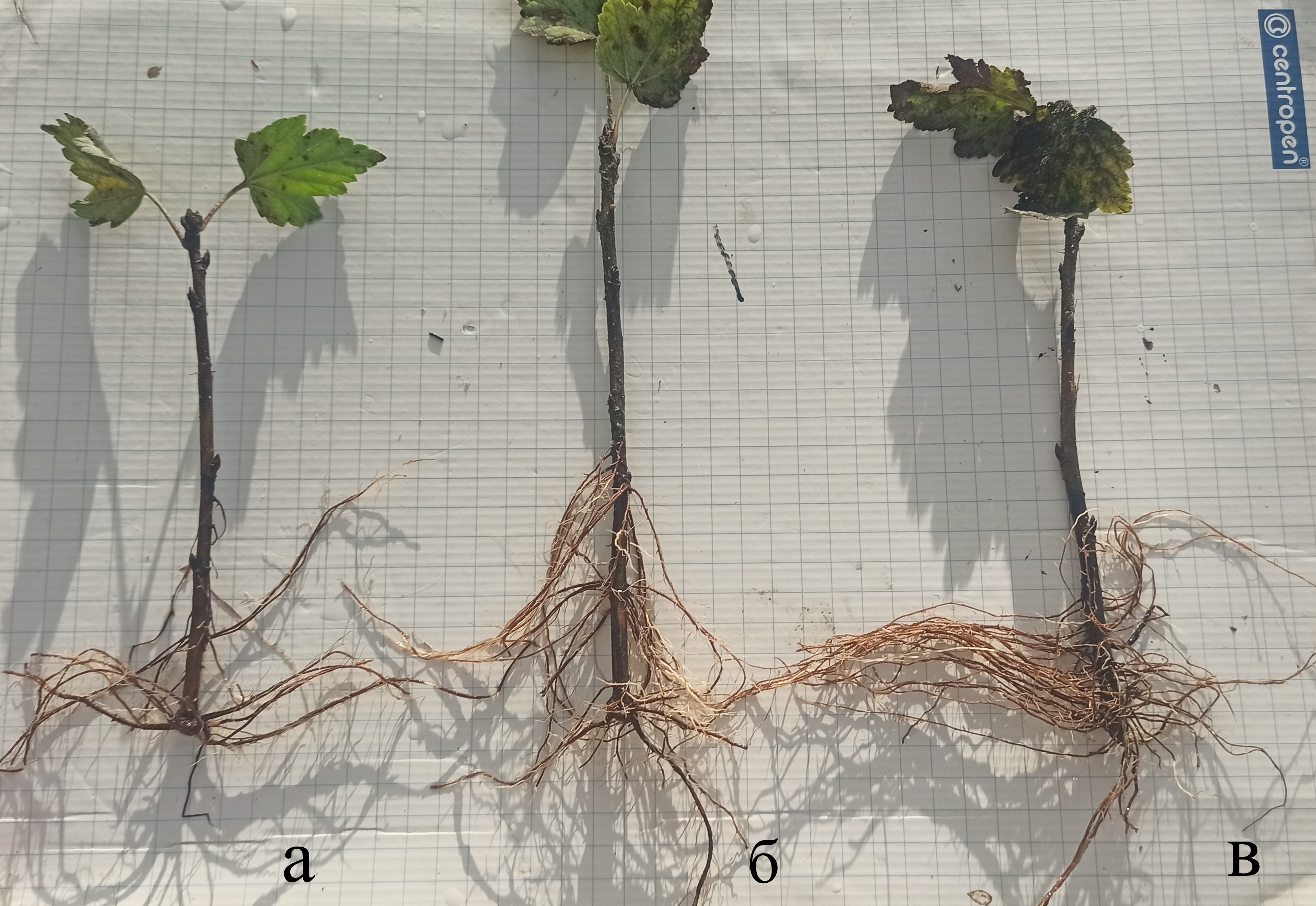 Рисунок 5 – Окоренившиеся черенки R. vulgare × R. atropurpureum обработанных НЧ Feh, допированного: а – Co; б – Si; в – контроль