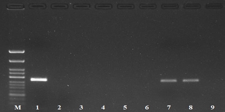 М – маркер молекулярного веса, 1 – Акварель, 2 – Алтын, 3 – Бова, 4 – Виола, 5 –Даренка, 6 – Дуэт, 7 – Италмас, 8 – Орлец, 9 – Торпеда