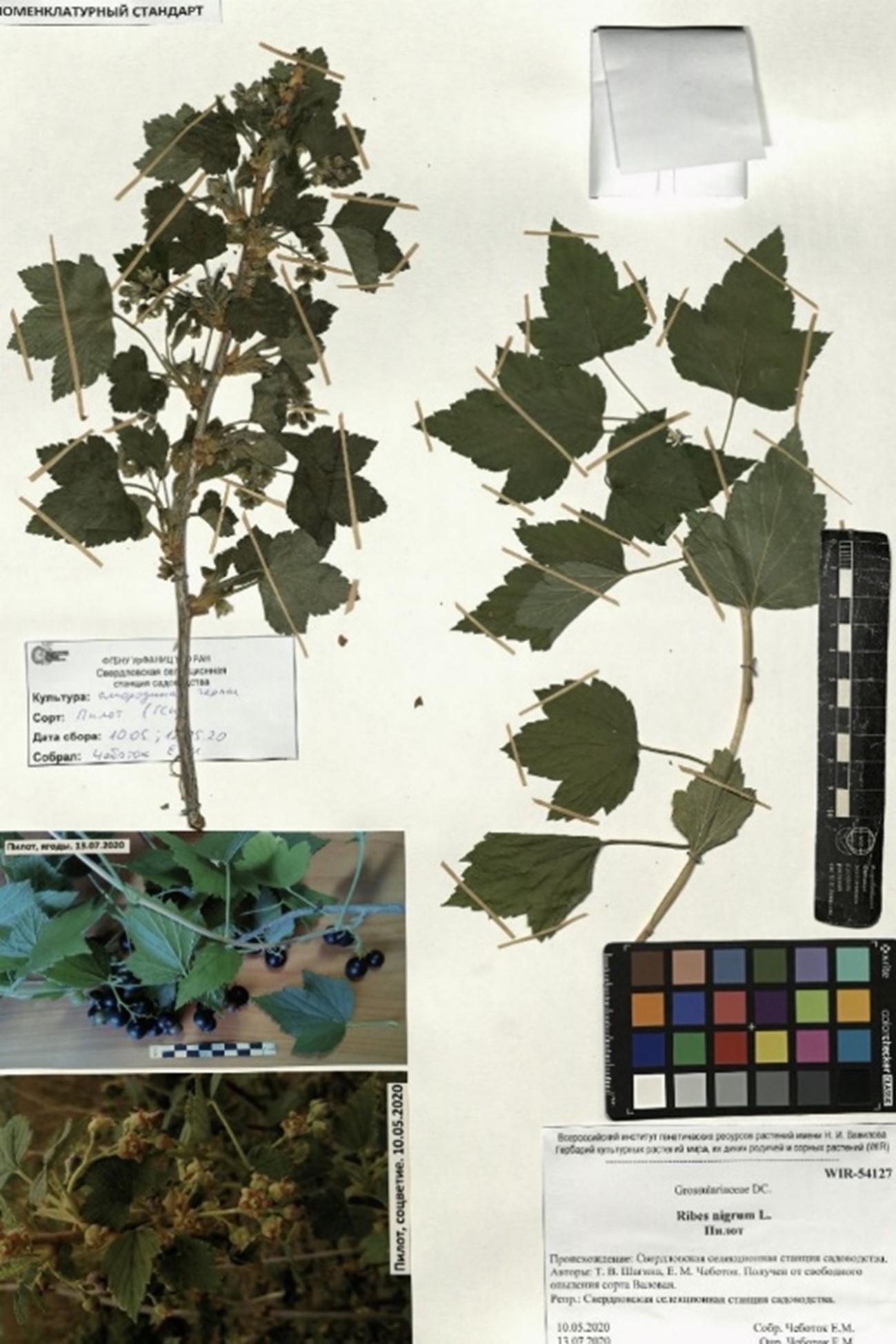 В 2020 году, в рамках договора о научном сотрудничестве, начата совместная работа с Всероссийским институтом генетических ресурсов растений имени Н.И. Вавилова (ВИР) по созданию номенклатурных стандартов 10 районированных сортов и 14 элитных форм смородины чёрной (Ribes nigrum L.) селекции станции. Для этого был собран растительный материал, загербаризированы и оформлены 24 образца в количестве 40 гербарных листов: ‘Аккорд’ (WIR-54112), ‘Василиса’ (WIR-54115), ‘Вымпел’ (WIR-54118), ‘Глобус’ (WIR-54119), ‘Добрый Джинн’ (WIR-54121) (рисунок 6), ‘Пилот’ (WIR-54127) (рисунок 7), ‘Славянка’ (WIR-54129), ‘Удалец’ (WIR-54132), ‘Фортуна’ (WIR-54133), ‘Шаман’ (WIR-54134) (Багмет и др., 2021), ‘Атаман’ (WIR-54113), ‘Викторина’ (WIR-54116), ‘Воевода’ (WIR-54117), ‘Доброхот’ (WIR-54120), ‘Корнет’ (WIR-54124), ‘Мушкетёр’ (WIR-54126), ‘Напев Уральский’ (WIR-54135), ‘Старатель’ (WIR-54130), ‘Валет’ (WIR-54114), ‘Драгун’ (WIR-54122), ‘Елисей’ (WIR-54123), ‘Маугли’ (WIR-54125), ‘Рада’ (WIR-54129), ‘Тарзан’ (WIR-54131) (Багмет и др., 2022).
