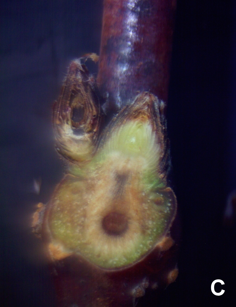 А - сорт сливы домашней Венгерка Корнеевская; В - сорт алычи Кубанская Комета; С - сорт абрикоса Викинг