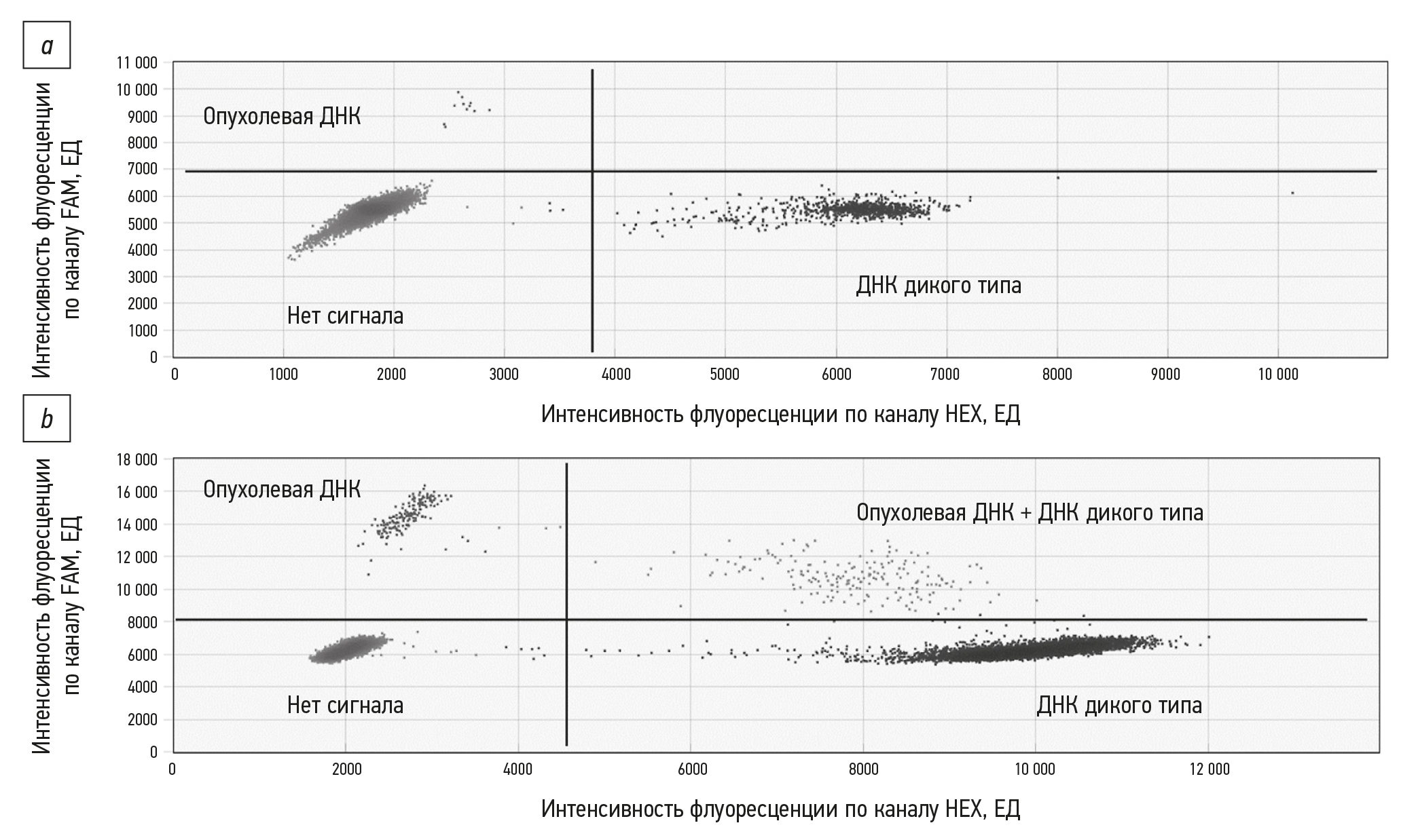 Рис. 1. Примеры результатов анализа внеклеточной ДНК в образцах биоматериала пациента с протоковой аденокарциномой поджелудочной железы: a — внеклеточная ДНК, выделенная из образца плазмы; b — внеклеточная ДНК, выделенная из образца желчи. Каждая точка на графике соответствует капле эмульсии, сгенерированной при проведении цифровой капельной ПЦР.