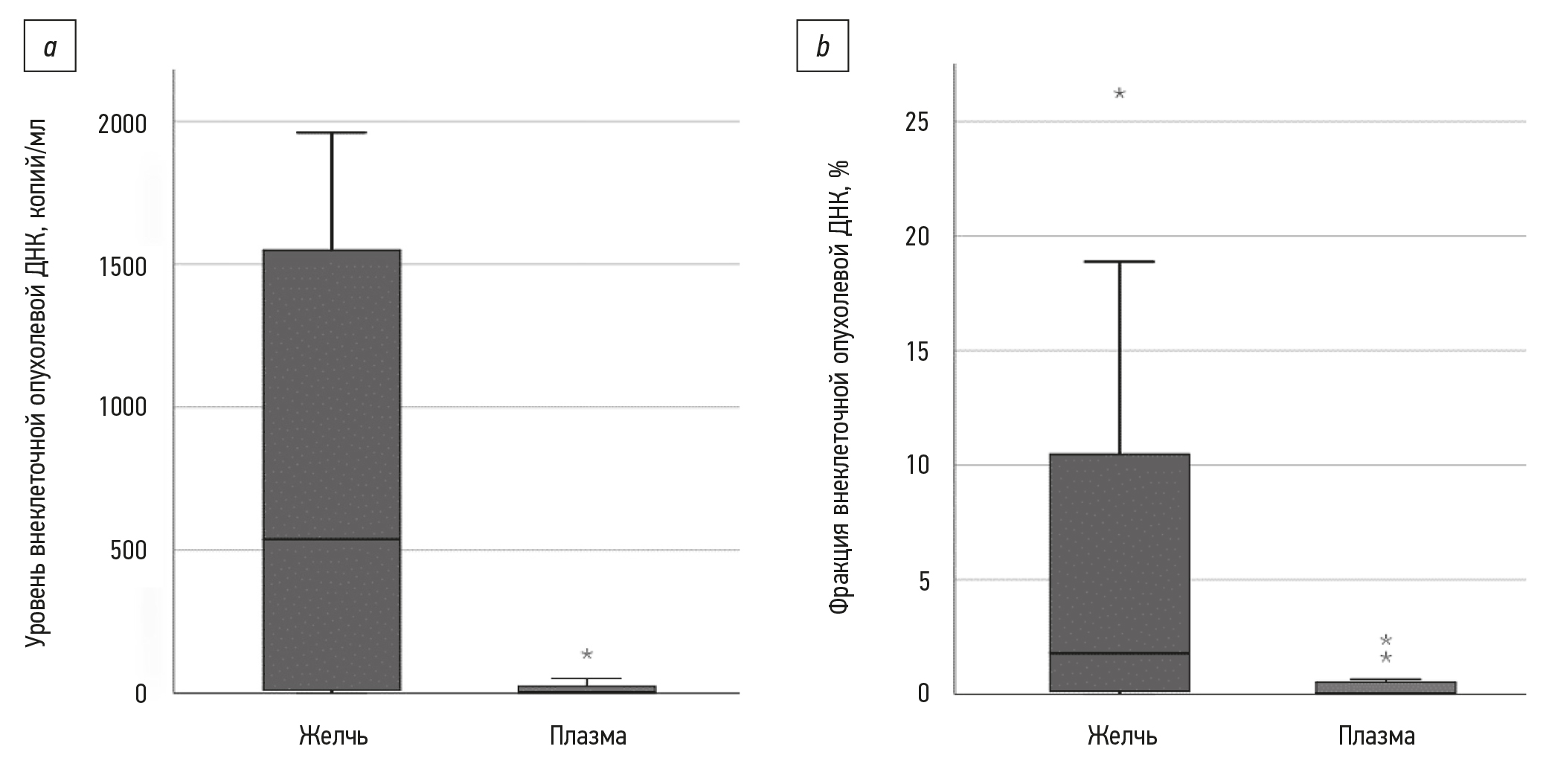Рис. 2. Сравнение результатов количественного анализа внеклеточной опухолевой ДНК в парных образцах желчи и плазмы: a — представление данных в виде копий на 1 мл биоматериала; b — представление данных в виде фракции внеклеточной опухолевой ДНК от общего уровня внеклеточной ДНК, %. * — выбросы; для сохранения пропорций на рисунке 2, a скрыты выбросы со значениями 5380, 7560, 17 460 копий/мл.