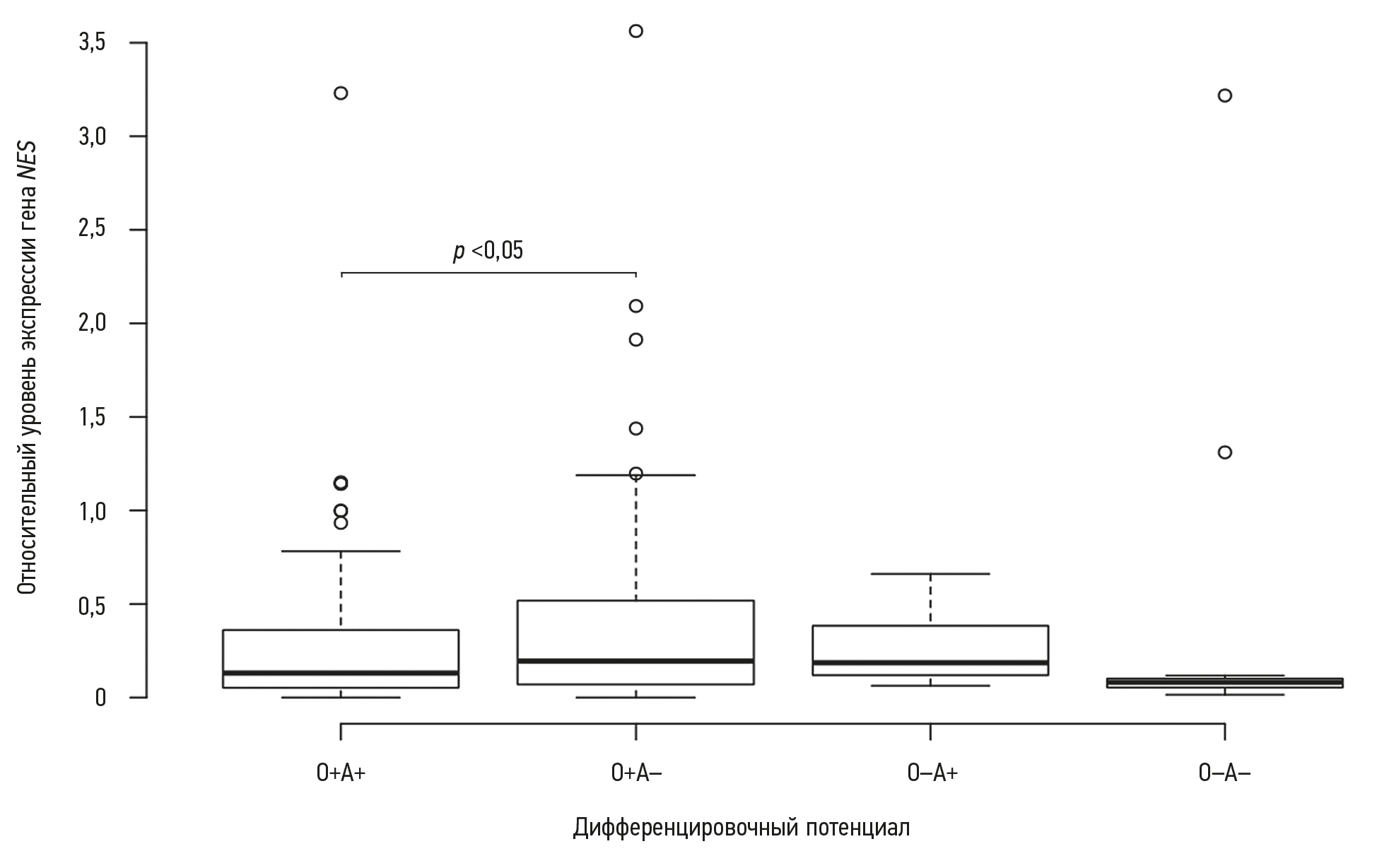 Рис. 2. Относительный уровень экспрессии гена NES в индивидуальных клонах колониеобразующих единиц фибробластов, различающихся по дифференцировочному потенциалу. Анализируемые группы: О+А+ — бипотентные предшественники, способные к остеогенной и к адипогенной дифференцировкам (n=149); О+А– — монопотентные предшественники, способные только к остеогенной дифференцировке (n=126); О–А+ — монопотентные предшественники, способные только к адипогенной дифференцировке (n=8); О–А– — стромальные клетки, не способные к указанным дифференцировкам (n=13). Статистическая значимость различий определена с помощью U-теста Манна–Уитни.