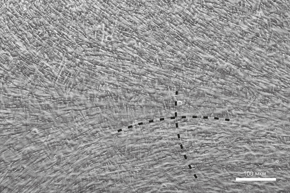 Fig. 1. The cell layer formed on the surface of the cell culture plastic plate on the fourth day of cultivation (phase-contrast microscopy). The dotted lines mark the keratocytes orthogonal orientation.