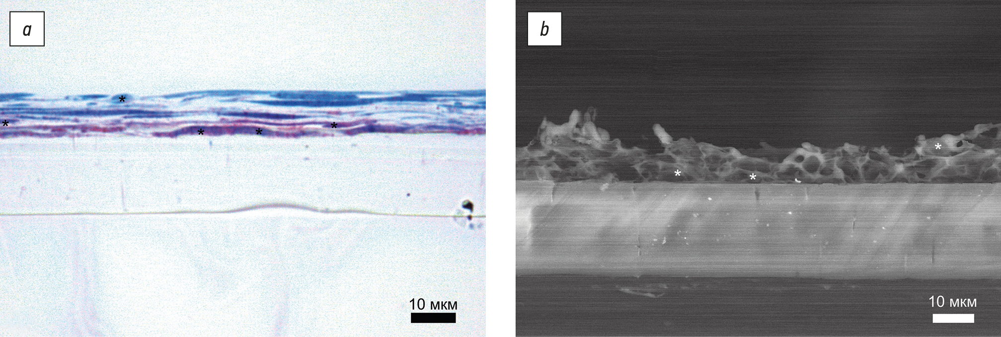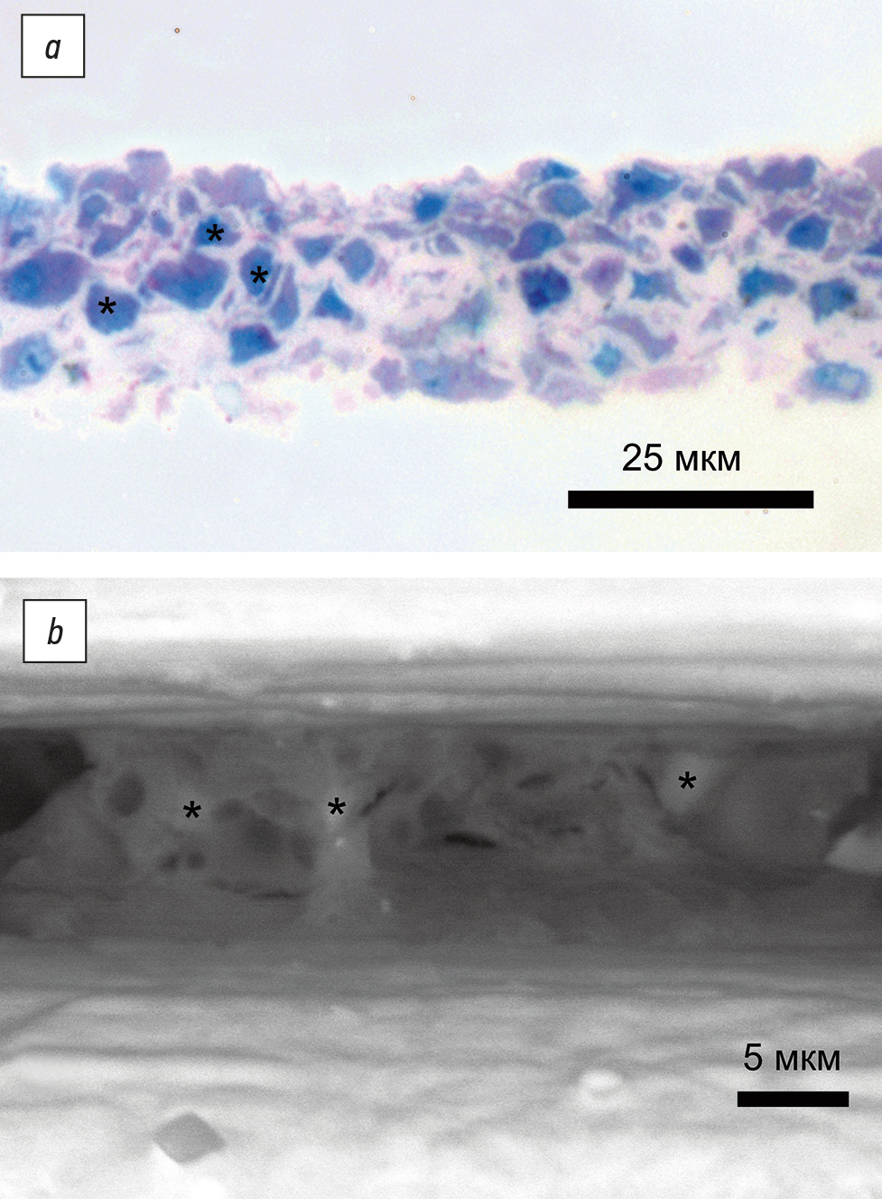 Рис. 2. Срез клеточного пласта, сформированного на поверхности культурального пластика (звёздочками отмечены ядра кератоцитов): a — световая микроскопия, окраска гематоксилином и эозином; b — сканирующая электронная микроскопия, лантаноидное контрастирование, режим детекции обратно-рассеянных электронов.