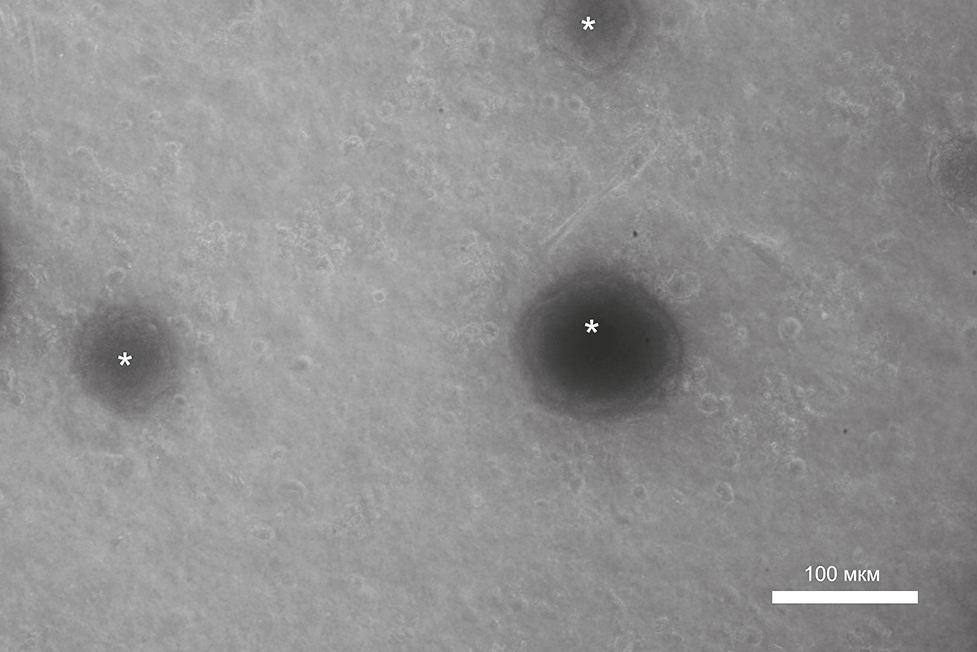 Fig. 3. Cellular aggregates formed on the silicone plate (phase-contrast microscopy). «Spheroids» are marked with asterisks.
